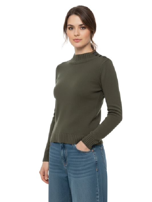 Dettaglio con Bottoni Distintivo: Bottoni tono su tono adornano la spalla sinistra, aggiungendo un tocco di eleganza ispirata al look militare e un elemento visivo distintivo che rende questo capo unico rispetto alla maglieria tradizionale.