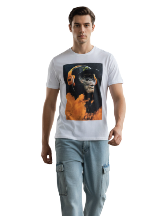 Il pezzo forte di questa maglietta è un ritratto iperrealistico e cinematografico di uno scimpanzé immerso nella sua musica.