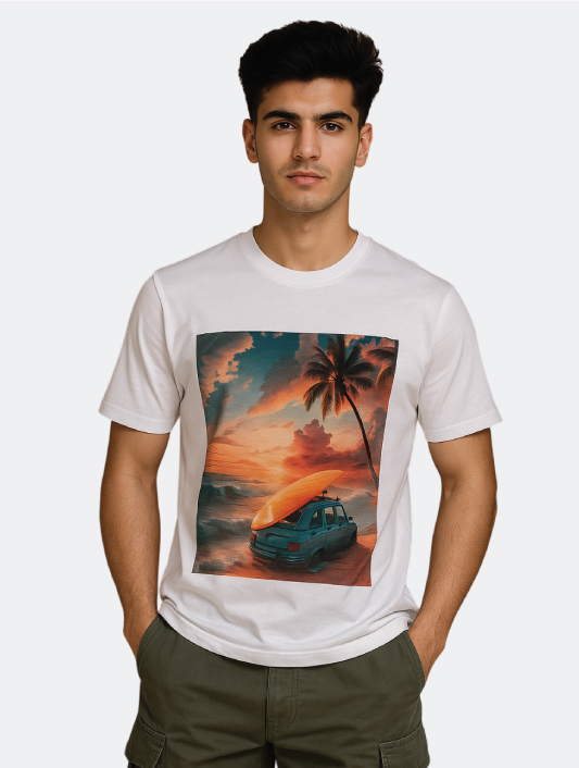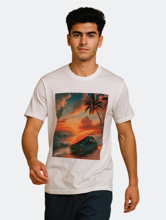 Cattura il momento perfetto della golden hour e portalo con te. Questa splendida T-shirt grafica di Jinnah Fashions è più di un semplice capo di abbigliamento; è uno stato d’animo, una mentalità e un biglietto per un’estate senza fine. Progettata per il sognatore, l’avventuriero e l’uomo che vive per la costa, questa maglietta è un’opera d’arte da indossare.