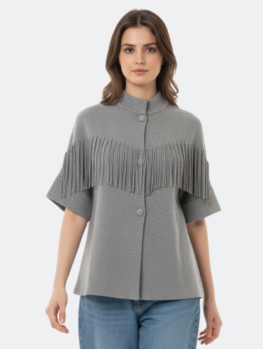 Carré con Frange Dinamiche: Il punto focale indiscusso del capo è l’ampio pannello di frange sottili e pendenti che si estende sul petto e sulle spalle, aggiungendo un movimento giocoso e un tocco di alta moda all’intero capo.